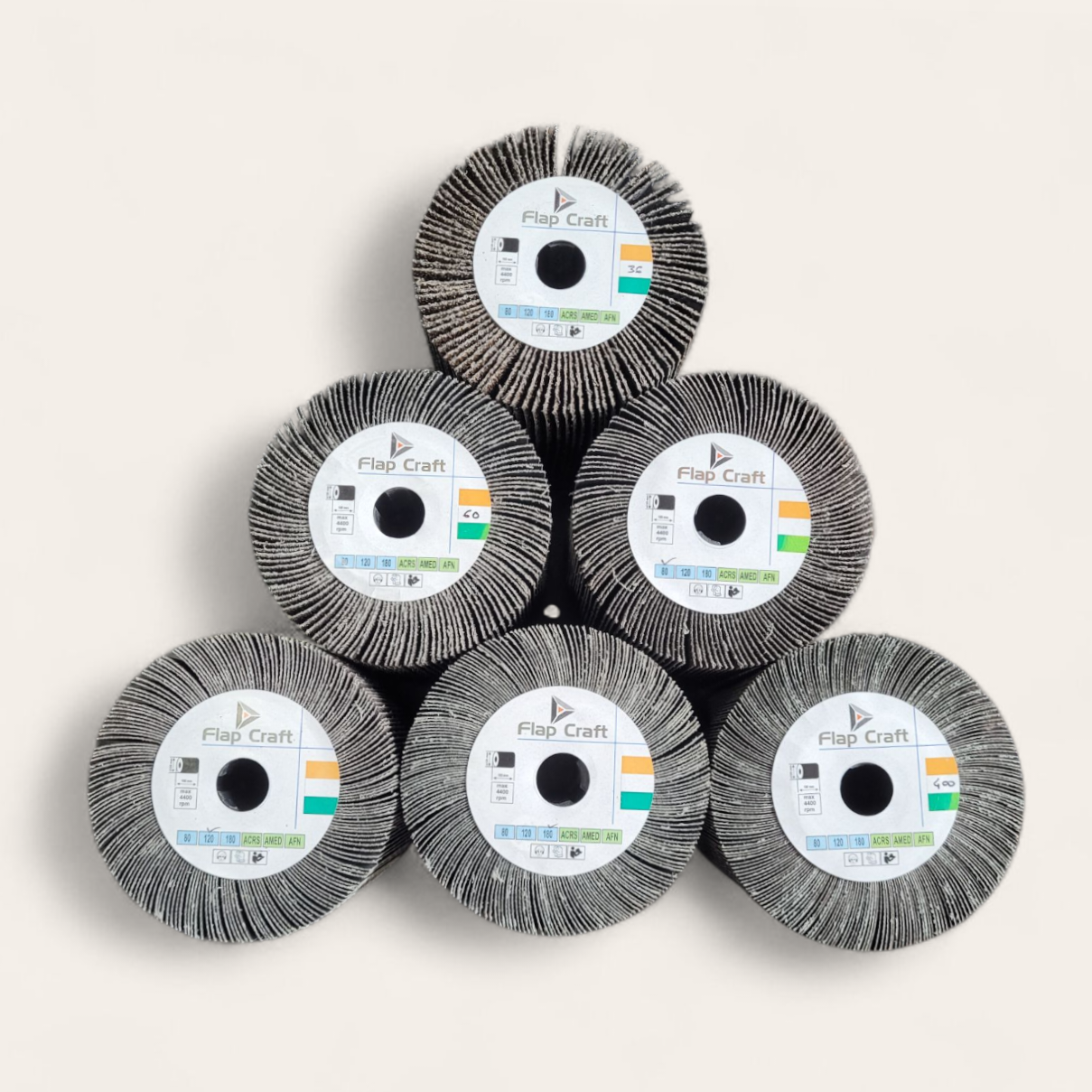 FlapCraft Alox Flap Wheel for Burnishing Machine. These flap wheels are made of high-quality Aluminium Oxide Cloth and gives excellent cutting and buffing on SS, MS or Non-Ferrous Surface. Available in Grit 36 to 400 Please call us for more details.